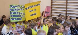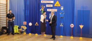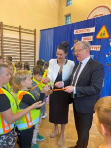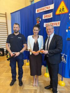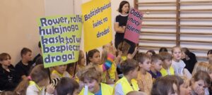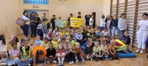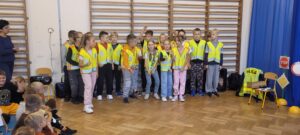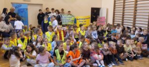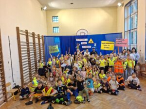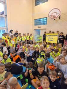 23 września 2025 roku w naszej szkole, w ramach akcji „Bezpieczna droga do szkoły”, odbyło się spotkanie uczniów klas 0–3 z młodszym aspirantem Grzegorzem Oleksym. Pan policjant przypomniał dzieciom zasady bezpieczeństwa w ruchu drogowym, zwracając szczególną uwagę na ogromną rolę elementów odblaskowych. Uczniowie aktywnie uczestniczyli w rozmowie, chętnie odpowiadali na pytania i wykazali się dużą wiedzą na temat znaków drogowych oraz prawidłowego przechodzenia przez ulicę. Dodatkowo zaprezentowali swoje umiejętności artystyczne – śpiewali piosenki, recytowali wierszyki i przygotowali kolorowe transparenty promujące bezpieczeństwo. Spotkanie uświetnił swoją obecnością Pan Artur Czernecki -Przewodniczący Zarządu Osiedla Falkowa, który wspólnie z funkcjonariuszem wręczył dzieciom elementy odblaskowe, podkreślając ich znaczenie dla bezpieczeństwa pieszych. Takie zajęcia to połączenie profilaktyki i edukacji, dzięki czemu już od najmłodszych lat uczymy dzieci odpowiedzialnych i bezpiecznych zachowań.