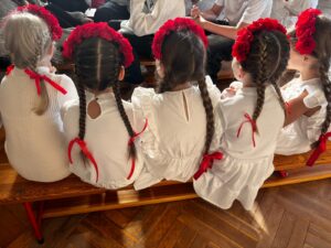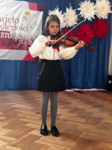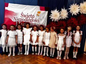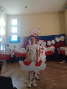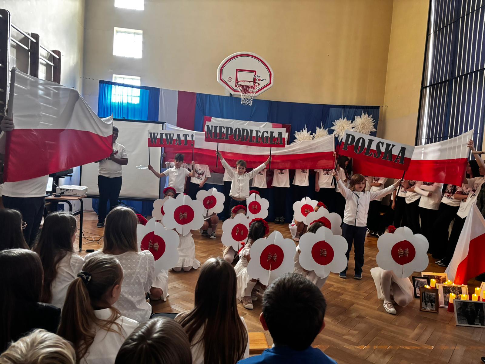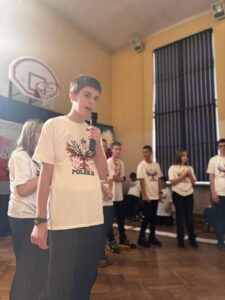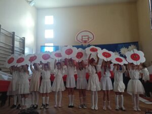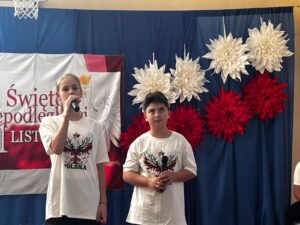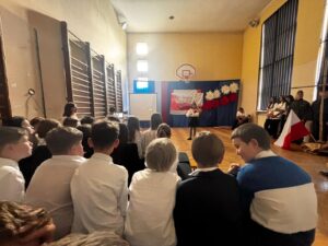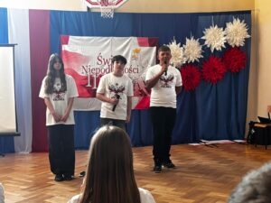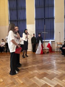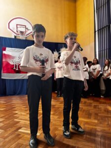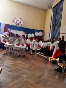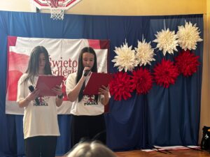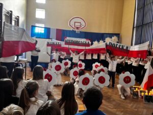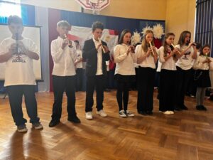Podczas uroczystości wspólnie odśpiewano hymn państwowy, który wybrani uczniowie z klas 5, 6 i 7 zagrali na fletach, tworząc wyjątkową, podniosłą atmosferę. Szkołę ozdobiono w barwy biało-czerwone   🇵🇱, co podkreśliło uroczysty i emocjonalny charakter wydarzenia.