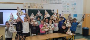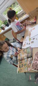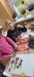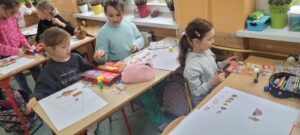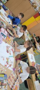 W ramach lekcji plastyki uczniowie klasy II robili piramidy zdrowia. Z przyniesionych gazetek sklepowych wycinali produkty spożywcze i wklejali na odpowiednie miejsca w piramidzie.