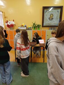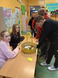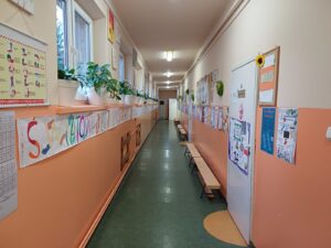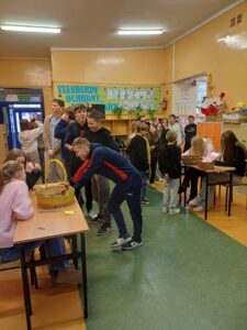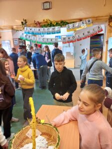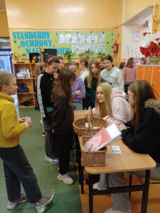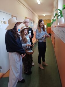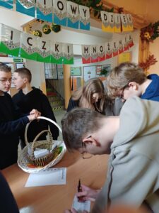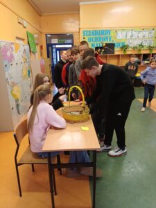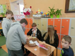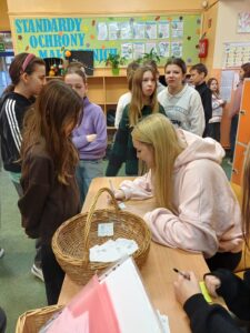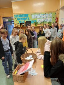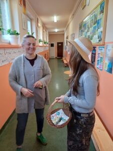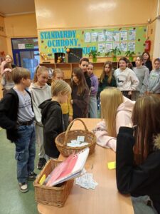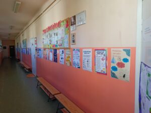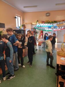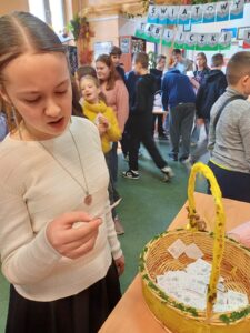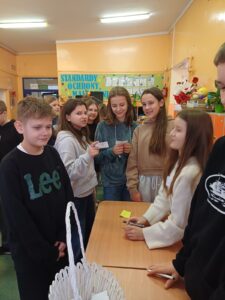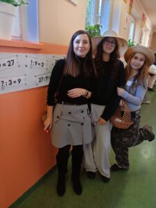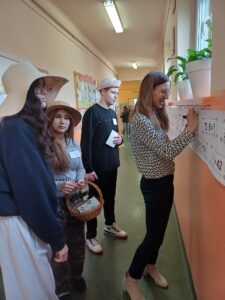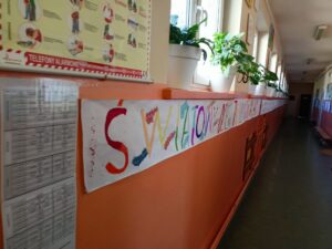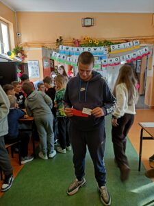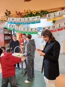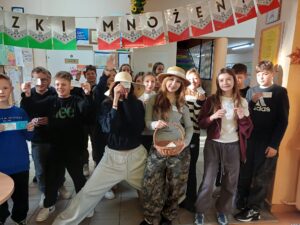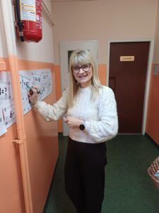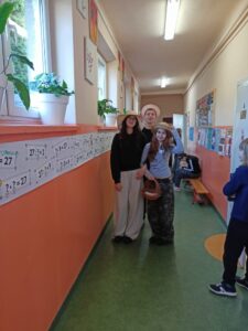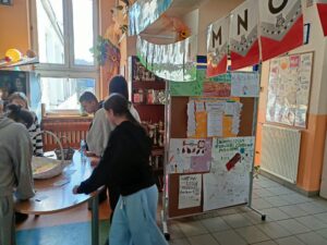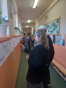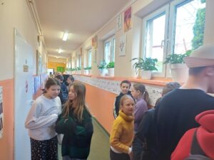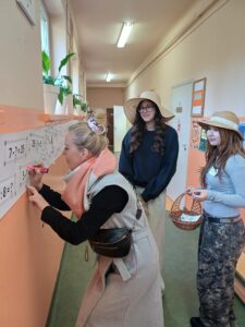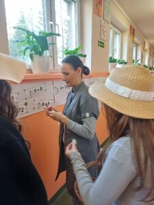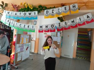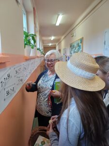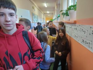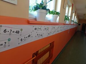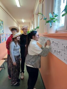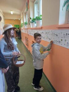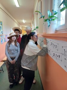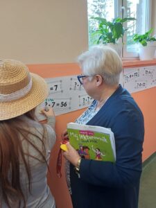 Nauczyciele, na czele z Panią Dyrektor, również aktywnie włączyli się w obchody – wspólnie uzupełniali działania z tabliczki mnożenia na kilkumetrowym plakacie, który stał się wyjątkową dekoracją szkolnego korytarza.
