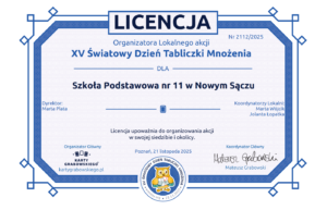 20.11.2025r. w naszej szkole po raz kolejny świętowaliśmy Światowy Dzień Tabliczki Mnożenia. Był to dzień pełen zabawy, matematycznych wyzwań oraz zdrowej rywalizacji. Uczniowie z zaangażowaniem rozwiązywali przygotowane zadania, sprawdzając swoją wiedzę i refleks. Najlepsi zdobyli certyfikaty Eksperta Tabliczki Mnożenia, potwierdzające ich doskonałą znajomość działań.